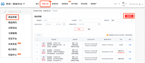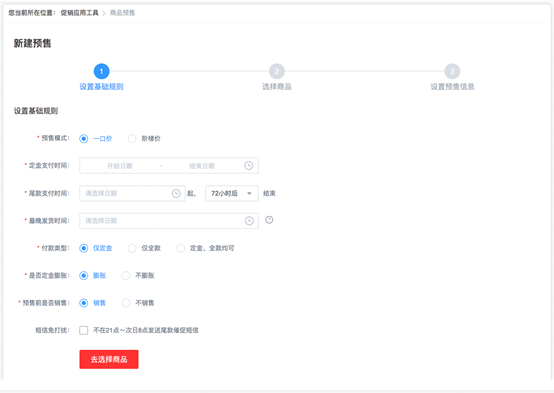 商家后台—>营销中心—>营销工具—>商品预售—>新建预售
