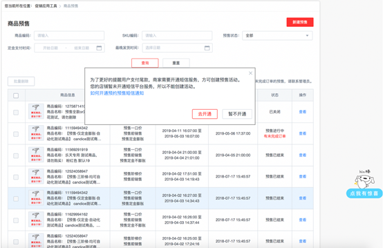 首先,为了更好的提醒用户支付尾款,商家需要开通短信服务,方可创建预售活动。如您未开通短信服务,在创建时会有弹窗提醒与开通指引。