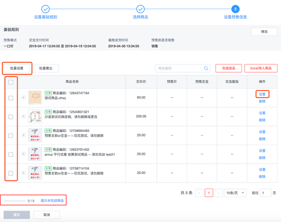 您可自由选择单个SKU设置,单个SPU设置,甚至是多个SPU一起设置。新版预售还可以帮您提示未完成商品,快速找到“漏网之鱼”,轻松完成创建。